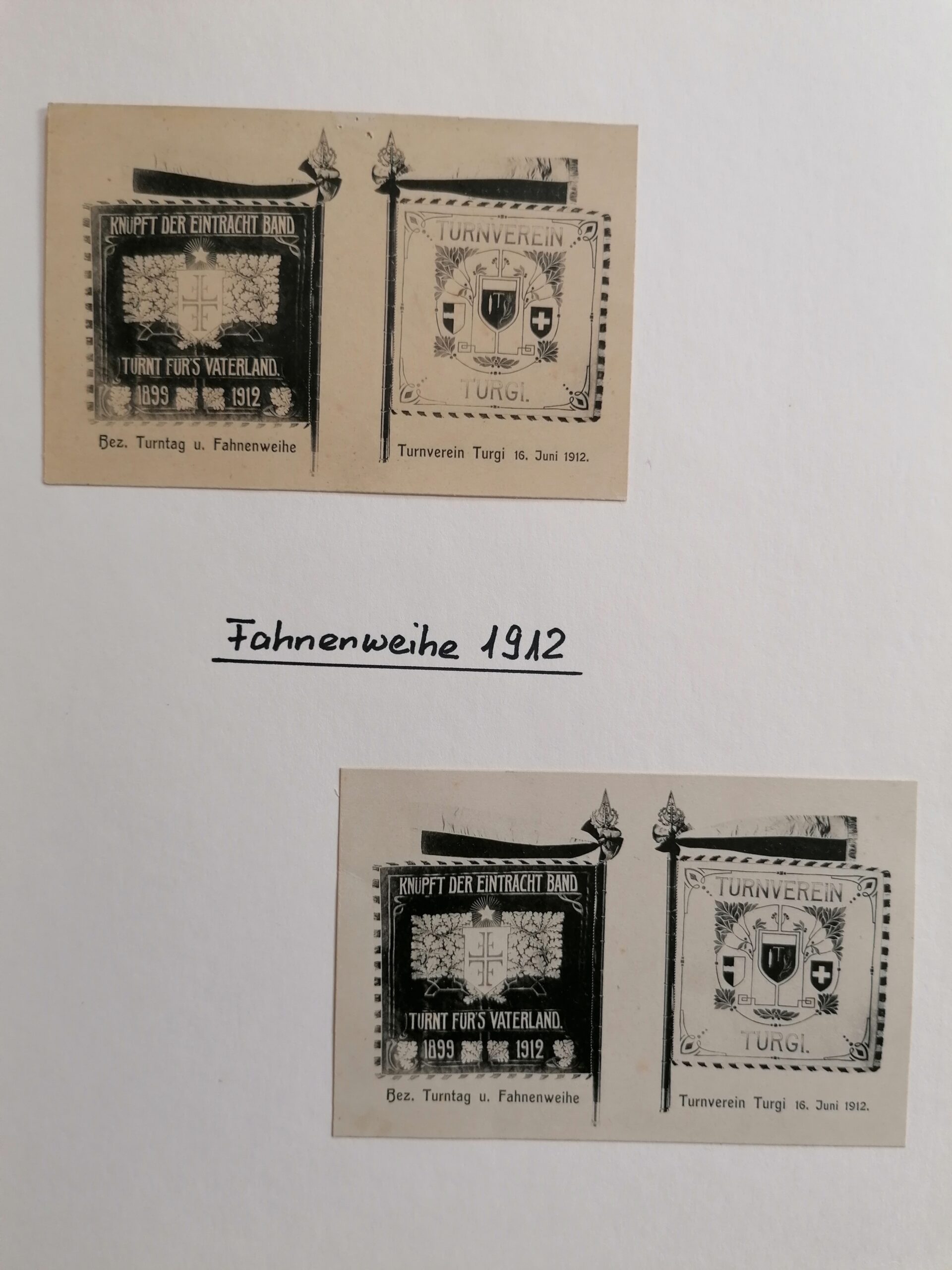 Die zweite Fahne wurde im Jahre 1912 angeschafft und stand unter dem Motto „Knüpft der Eintracht Band, turnt für’s Vaterland“.